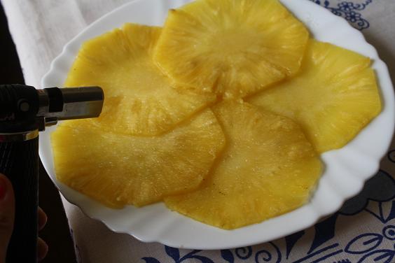 2. Ananás posypeme cukrom, polejeme trochou rumu a flambujeme(opaľujeme).