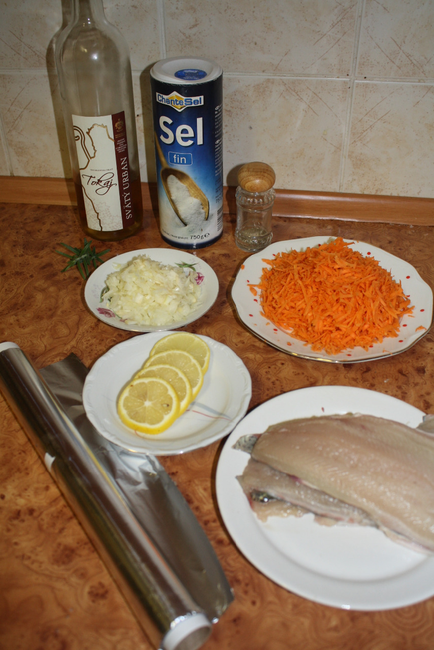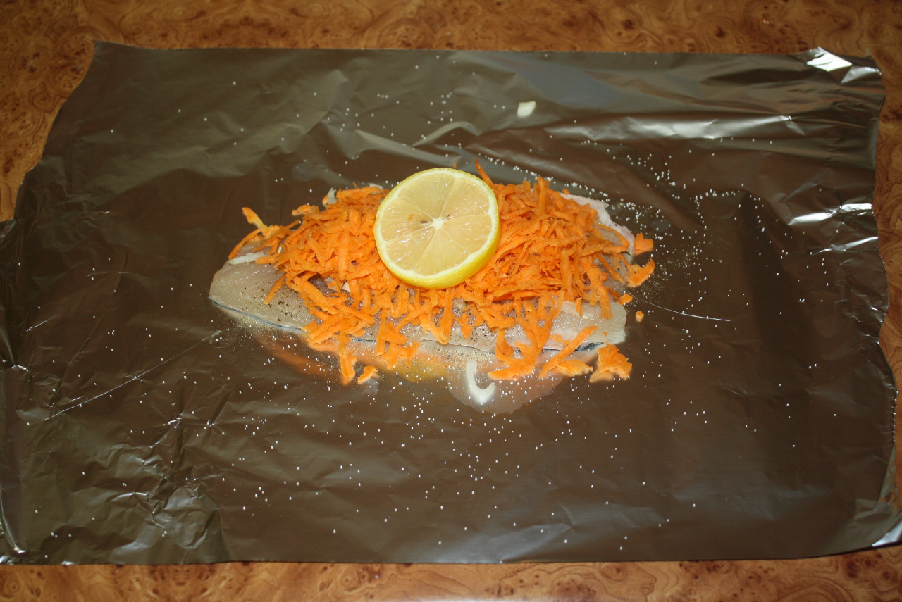 Odstrihneme si kus alobalu tak aby okraje boli dostatočne veľké na zabalenie ryby, záleží od veľkosti filetov. Položíme filé kožou nadol, osolíme, okoreníme, posypeme nadrobno nasekaným čerstvým rozmarínom, posypeme nasekanou cibuľou, postrúhanou mrkvou a do stredu položíme plátok citrónu.