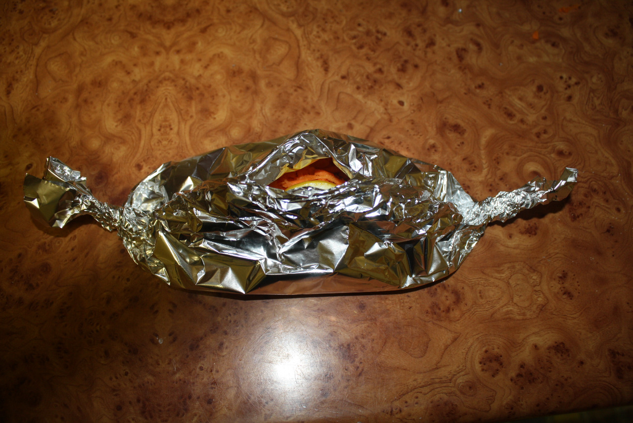 Konce zakrútime aby to vyzeralo ako nejaký bonbón. V strede opatrne oddelíme alobal a vytvoríme dieru aby sme cez ňu mohli naliať víno. Nalejeme len trochu aby sa ryba mala v čom dusiť, asi 0,5 dl uzavrieme dieru a dáme piecť do rúry na 180°C asi 15 minút.