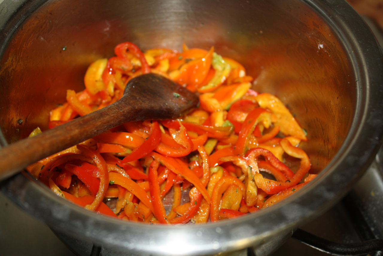 V hrnci rozpálime olej a vložíme papriku spolu s rozmarínom a tymiánom. Premiešame a opečieme asi 5 minút.