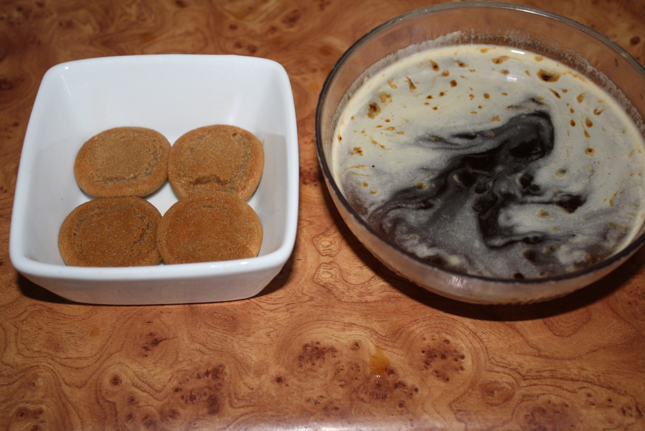1. do menšej misky si rozmiešame kávu s horúcou vodou, premiešame s karamelovým sirupom, rumom a následne namáčame piškóty.