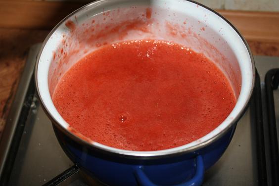 4. Zvyšok jahôd rozmixujeme, prilejeme 1 dcl vody, premiešame s cukrom a varíme kým nám omáčka trochu nezhustne. Podávame teplé s čerstvo uvarenými guľkami.